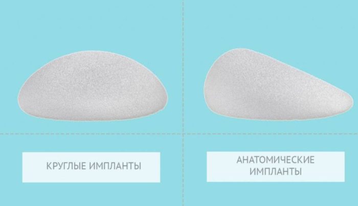 По форме импланты бывают круглыми либо анатомическими (каплевидными). Круглые придают груди более выразительный вид, обеспечивают больший объем в верхней части груди. Они часто используются для достижения эффекта push-up. Анатомические импланты имеют форму капли и имитируют естественную форму груди.